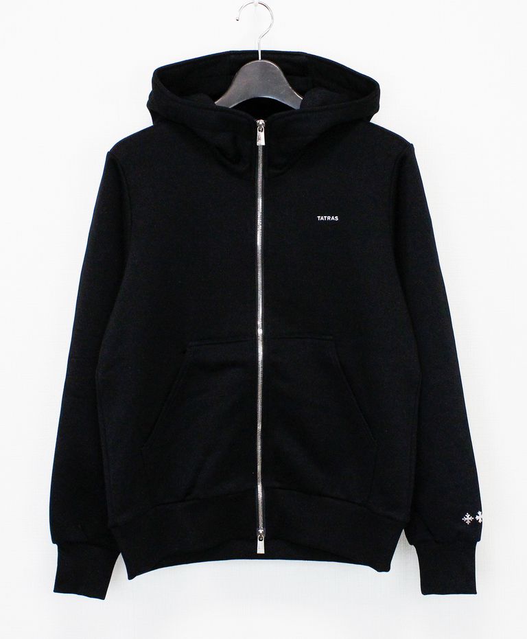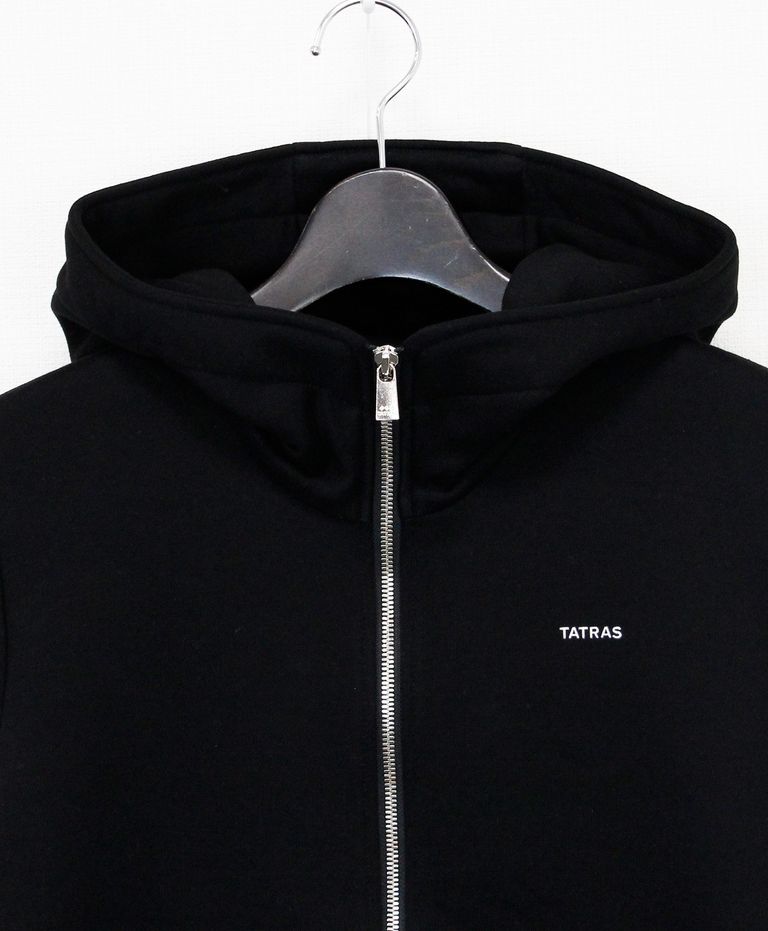 控えめサイズのTATRASロゴを胸元にあしらったフーディー。