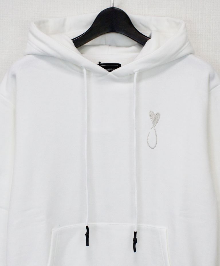 ブランドアイコン“ハートフィッシュ”の刺繍が印象的なプルオーバーフーディー。