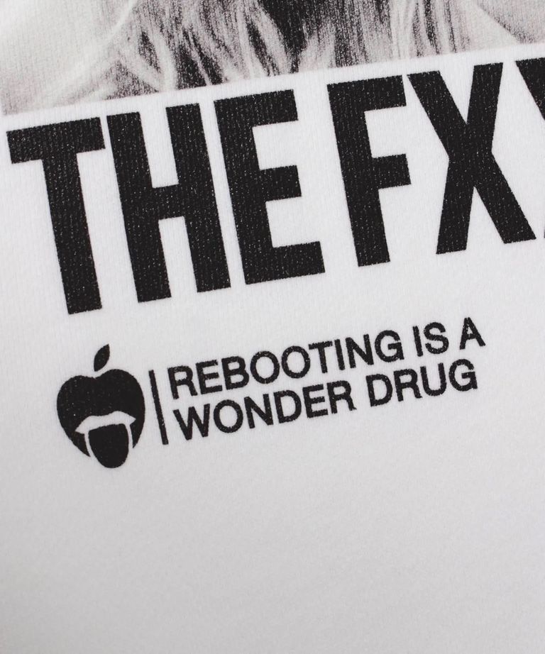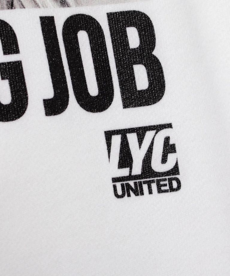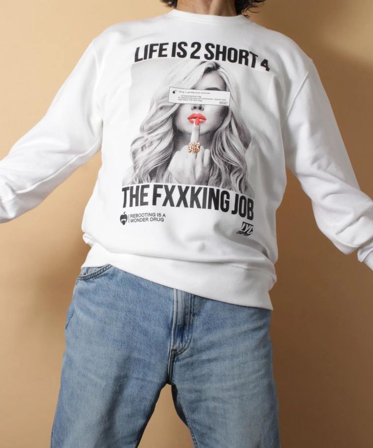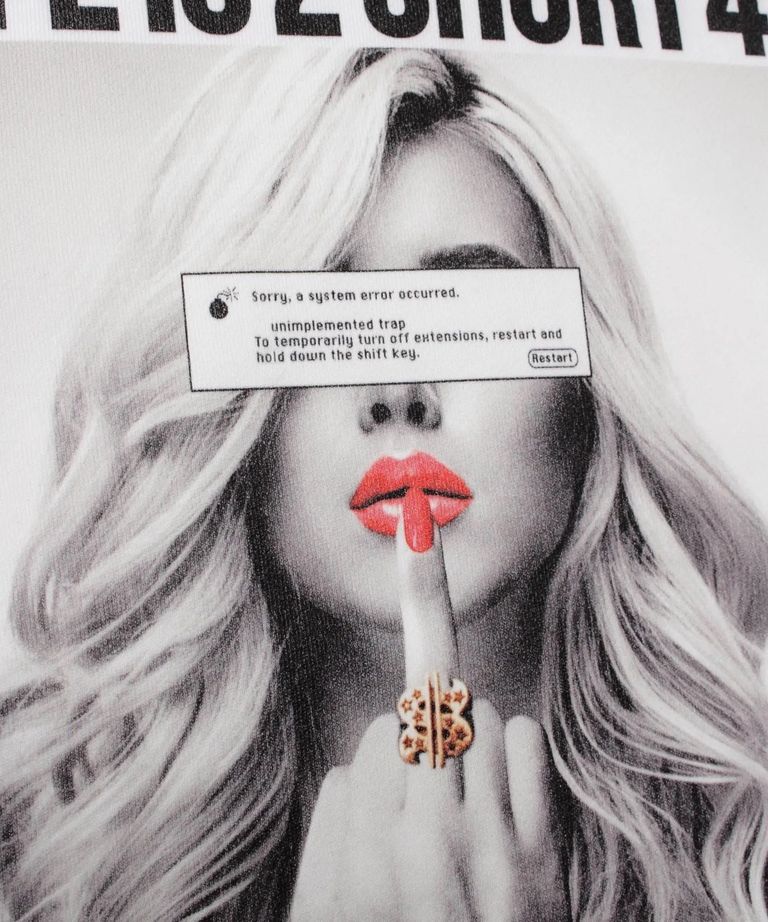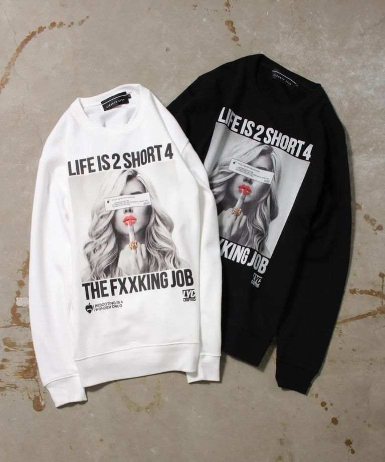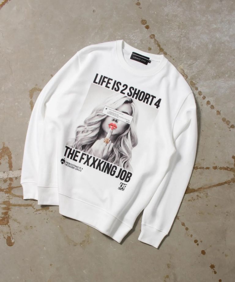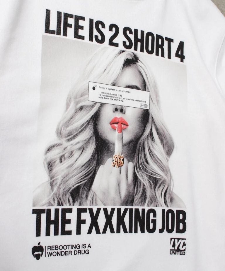 ブランド・アイデンティティである[LIFE IS 2 SHORT 4 THE FXXKING JOB]のメッセージをオールドMacのシステムエラーマークでコラージュした、ガールズフォト・ライトスェット・トレーナーです。