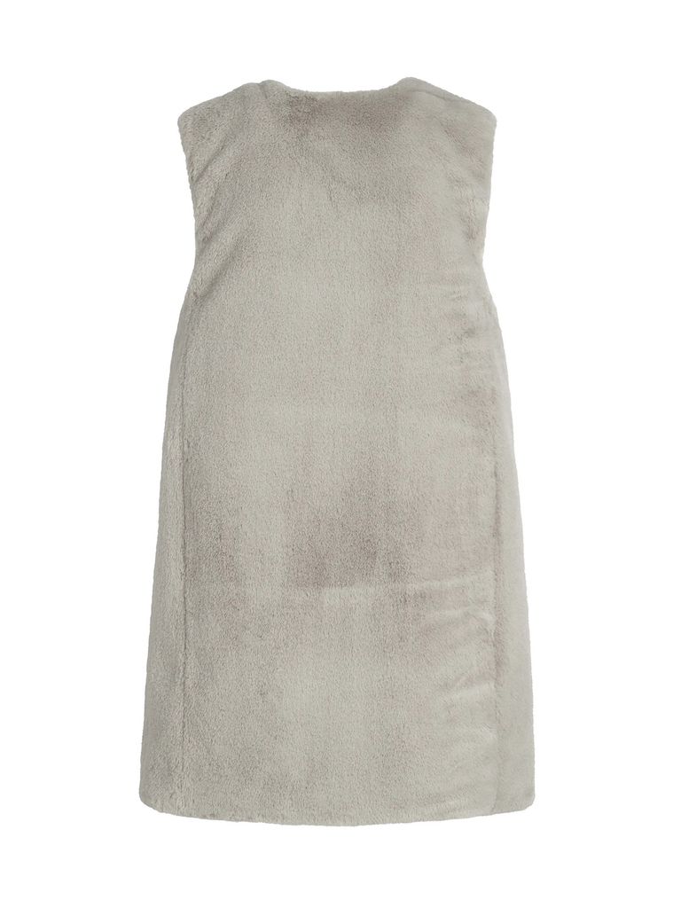 艶のある華やかなボア素材を使用したノーカラーロングベスト。