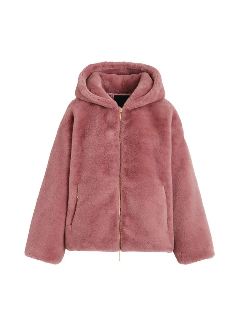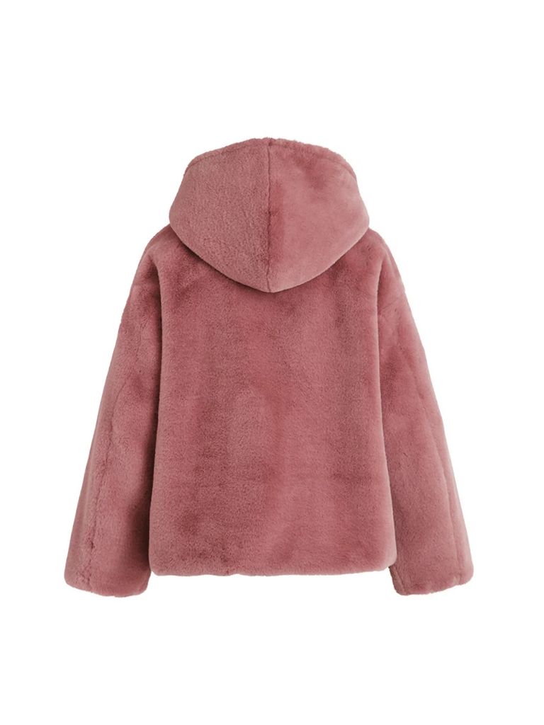 艶やかなラビットファー調エコファーを使用して、ラグジュアリーな表情に仕上げたフード付きブルゾン。
