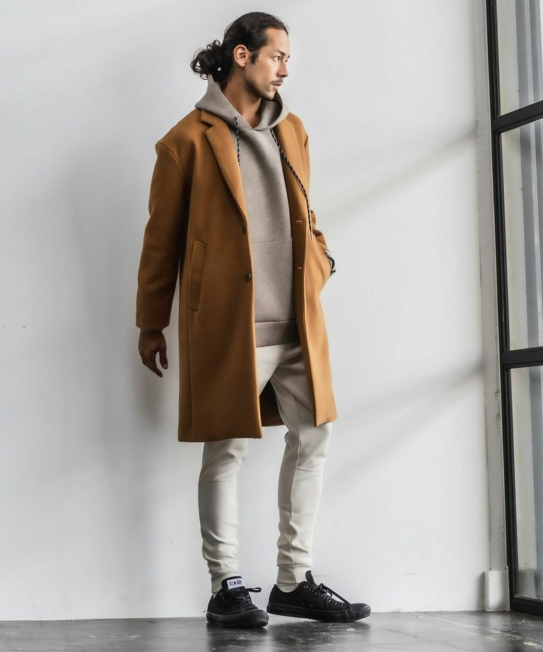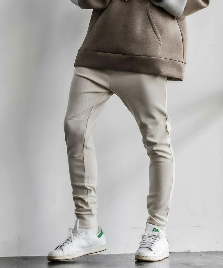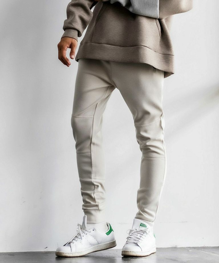 ワタリから裾にかけてテーパードしたスキニーパンツ。