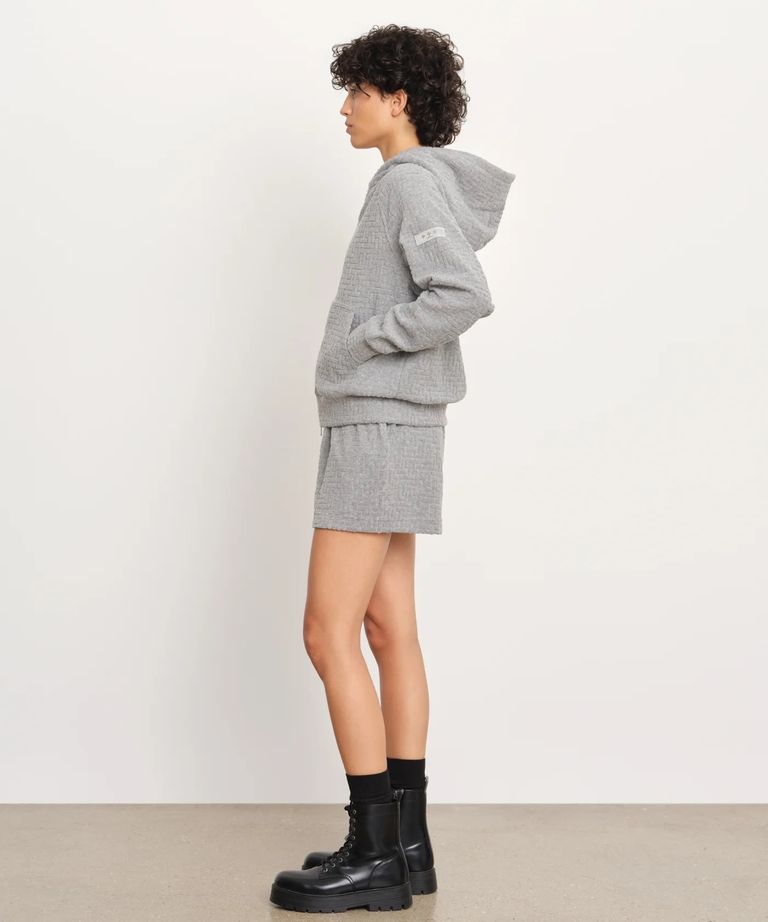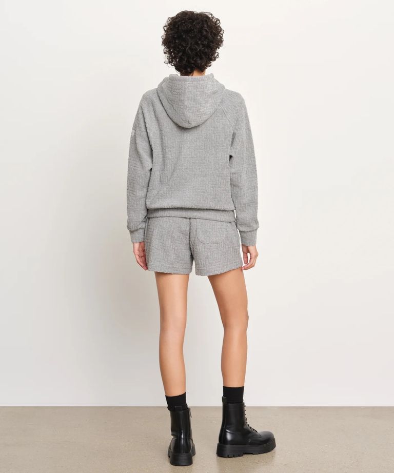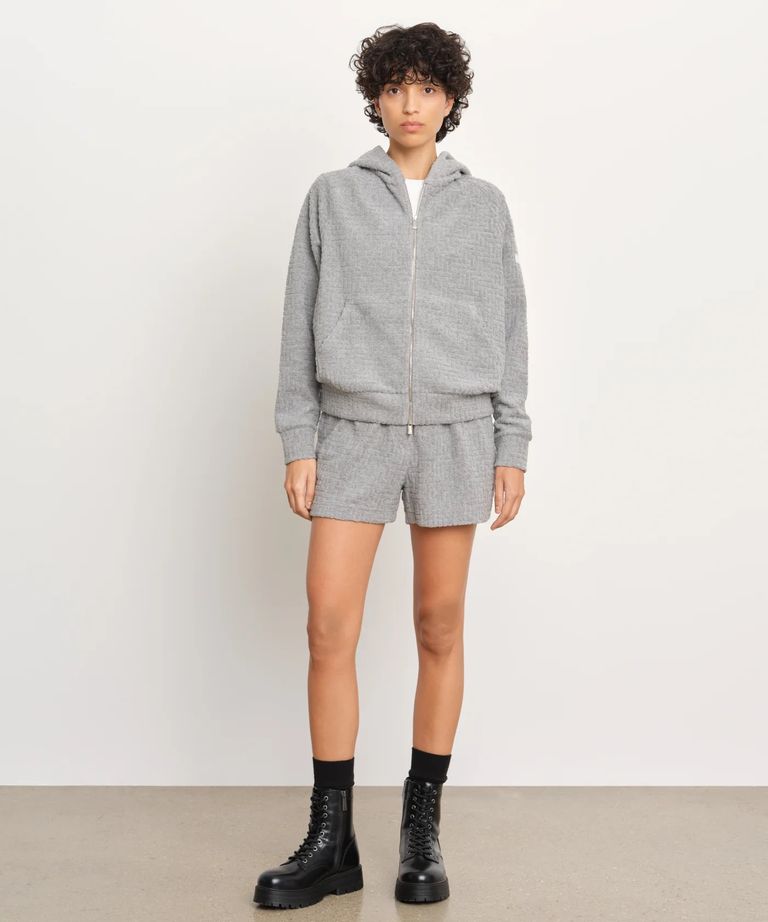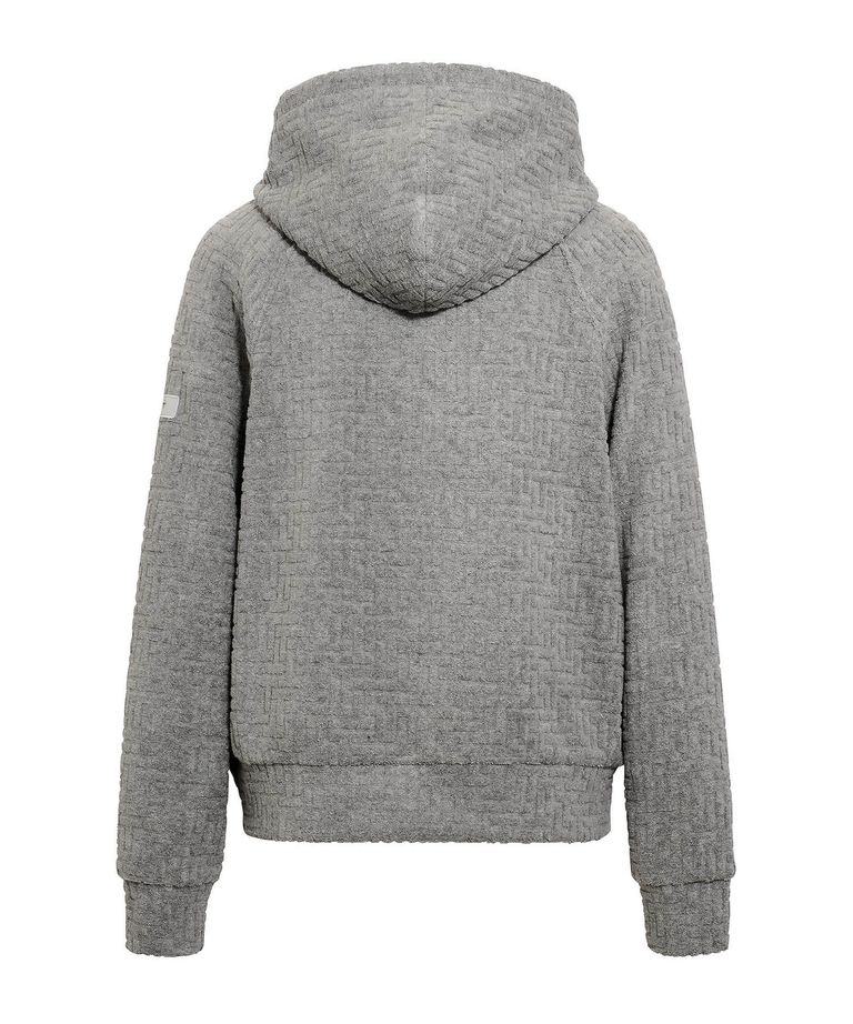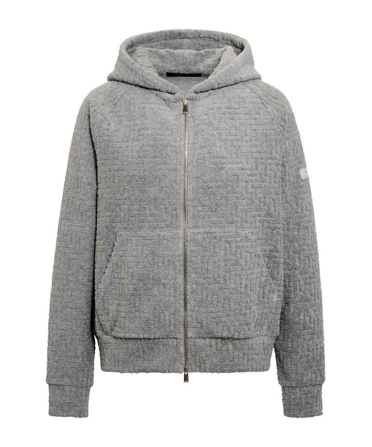 モノグラム柄をジャカード編みで立体的に表現した、カジュアルなパイル素材パーカー。